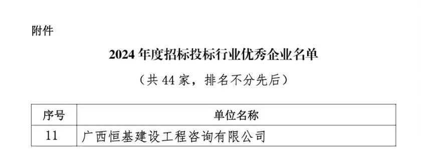 2025年9月22日,广西建筑业联合会公布了2024年度招标投标行业优秀企业和优秀工作者名单,广西恒基建设工程咨询有限公司凭借卓越的专业能力和优质的服务,成功荣获2024年度招标投标行业优秀企业称号,多名员工同时荣获招标投标行业优秀工作者称号。