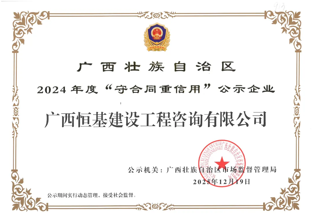 此次获评2024年度广西“守合同重信用”企业,不仅是对恒基咨询过往诚信经营成果的充分肯定,更是对企业未来发展的激励与鞭策。作为深耕行业的专业咨询公司,恒基咨询将以此次获评为契机,持续深化企业信用体系建设,进一步提升合同管理与诚信经营的规范化水平,切实履行企业社会责任。同时,充分发挥“守合同重信用”企业的示范引领作用,积极带动行业伙伴共同营造守信践诺、公平竞争、规范有序的市场环境,以诚信赋能企业高质量发展,为广西区域经济社会发展与信用体系建设贡献力量。