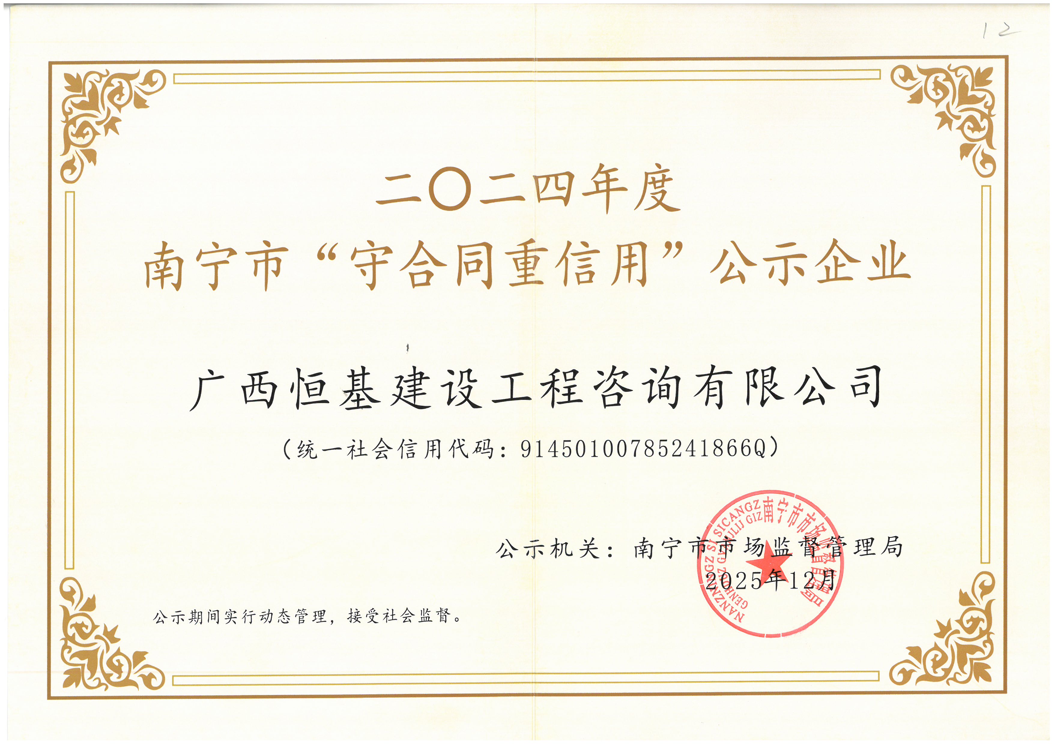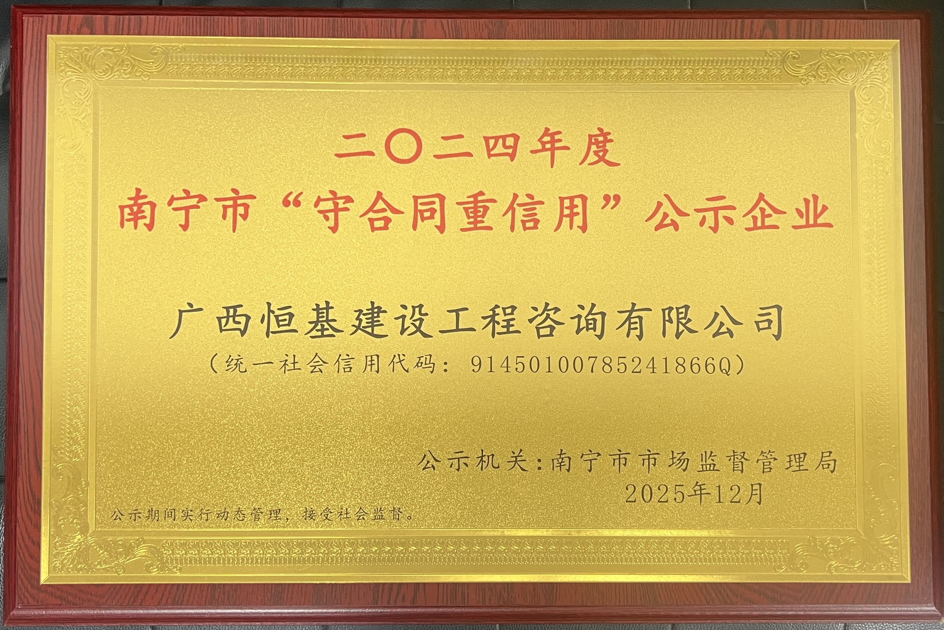 近日,南宁市市场监督管理局公布2024年度南宁市“守合同重信用”企业公示结果,广西恒基建设工程咨询有限公司成功入选,企业诚信建设再获官方认可。